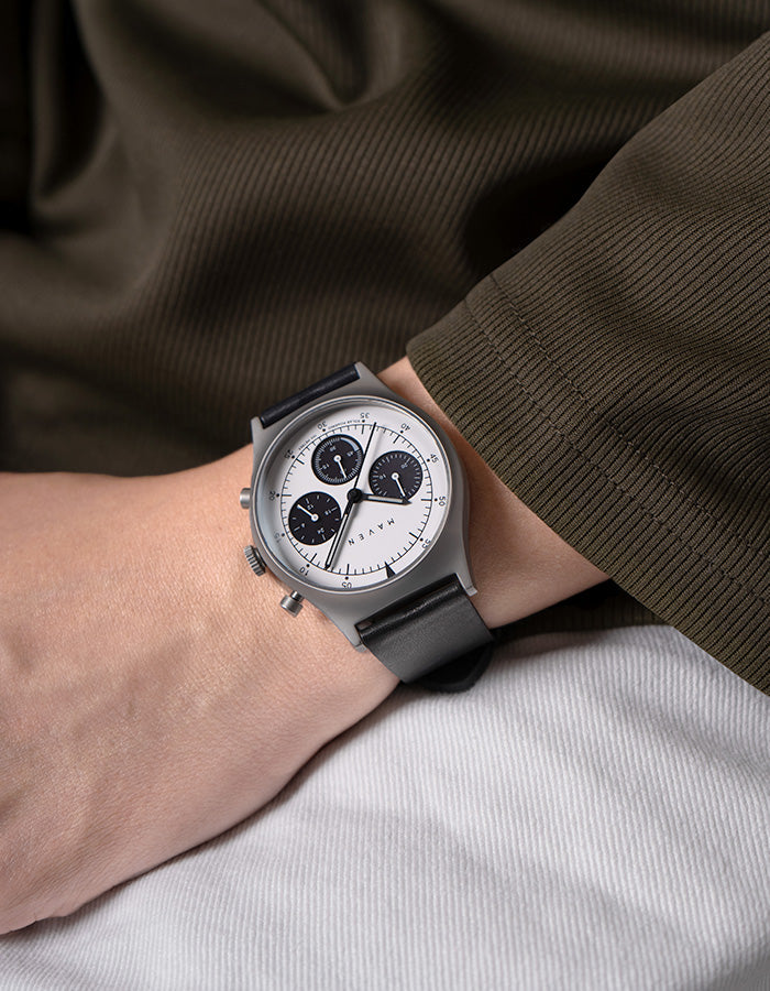 A symbol of MAVEN’s minimalist silhouette, the MUS Solar Chrono follows similar design cues to the MUS collection but with some upgrades to its appearance and an advanced solar-powered movement. Powered by Japanese solar movement, the watch relies on exposure to direct light, whether it is sunlight on the beach or under your desk lamp. Once fully charged, the power storage can last up to 5 months, and the power reserve indicator is easily visible.